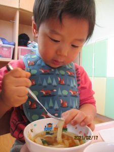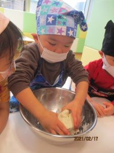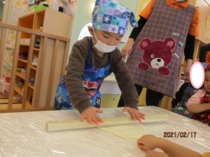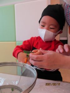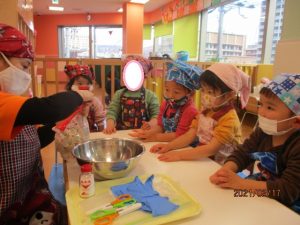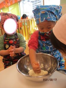 2歳児さんが食育の一環で行っているクッキング。今月も楽しい時間を過ごす事が出来ました![]()