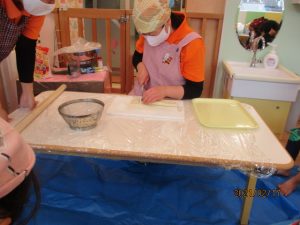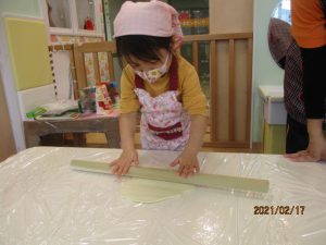 みんなが頑張って伸ばした生地を、先生たちが包丁でトントントン?
