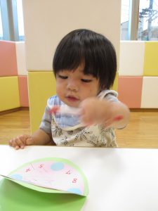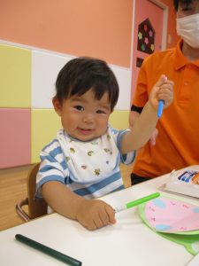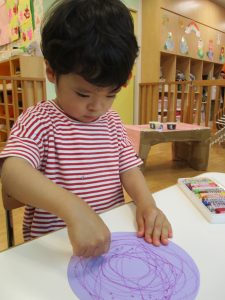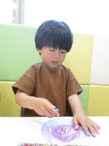 最後はクルクル模様に絵の具を塗ってはじき絵をしました!