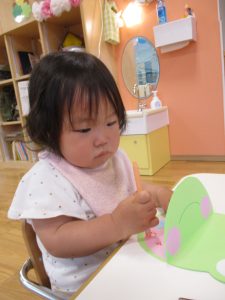 初めてのクーピーに真剣な表情です(^ω^)