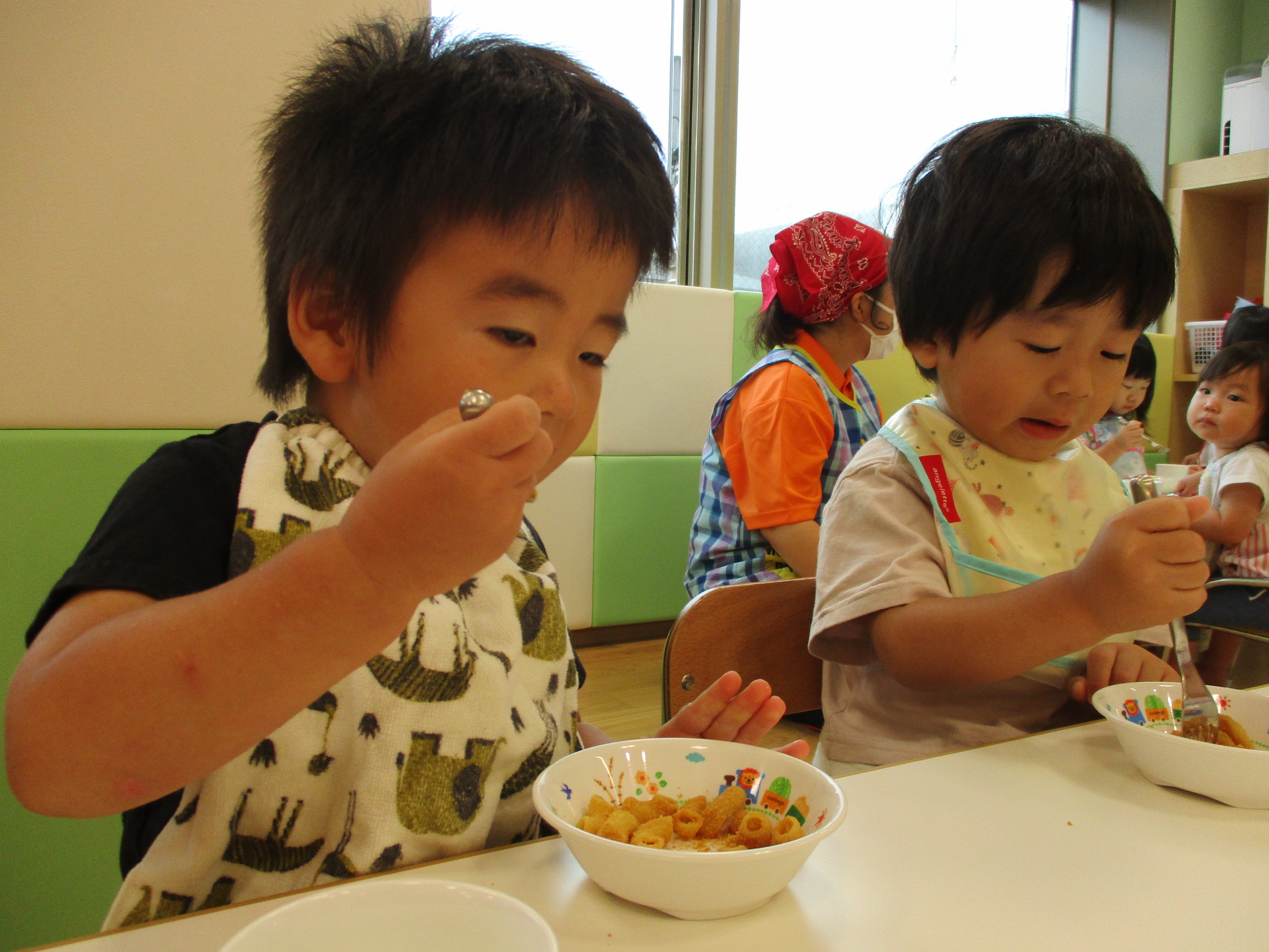 寝起きですが、おやつはしっかりと食べてくれる子どもたちです(笑)