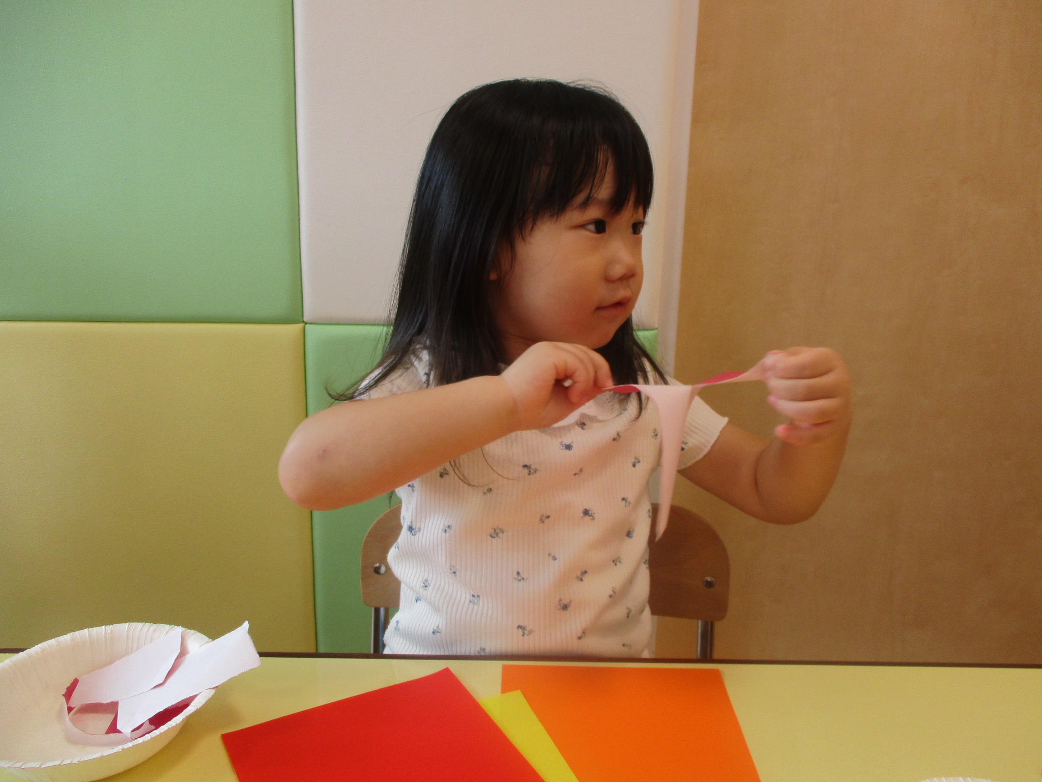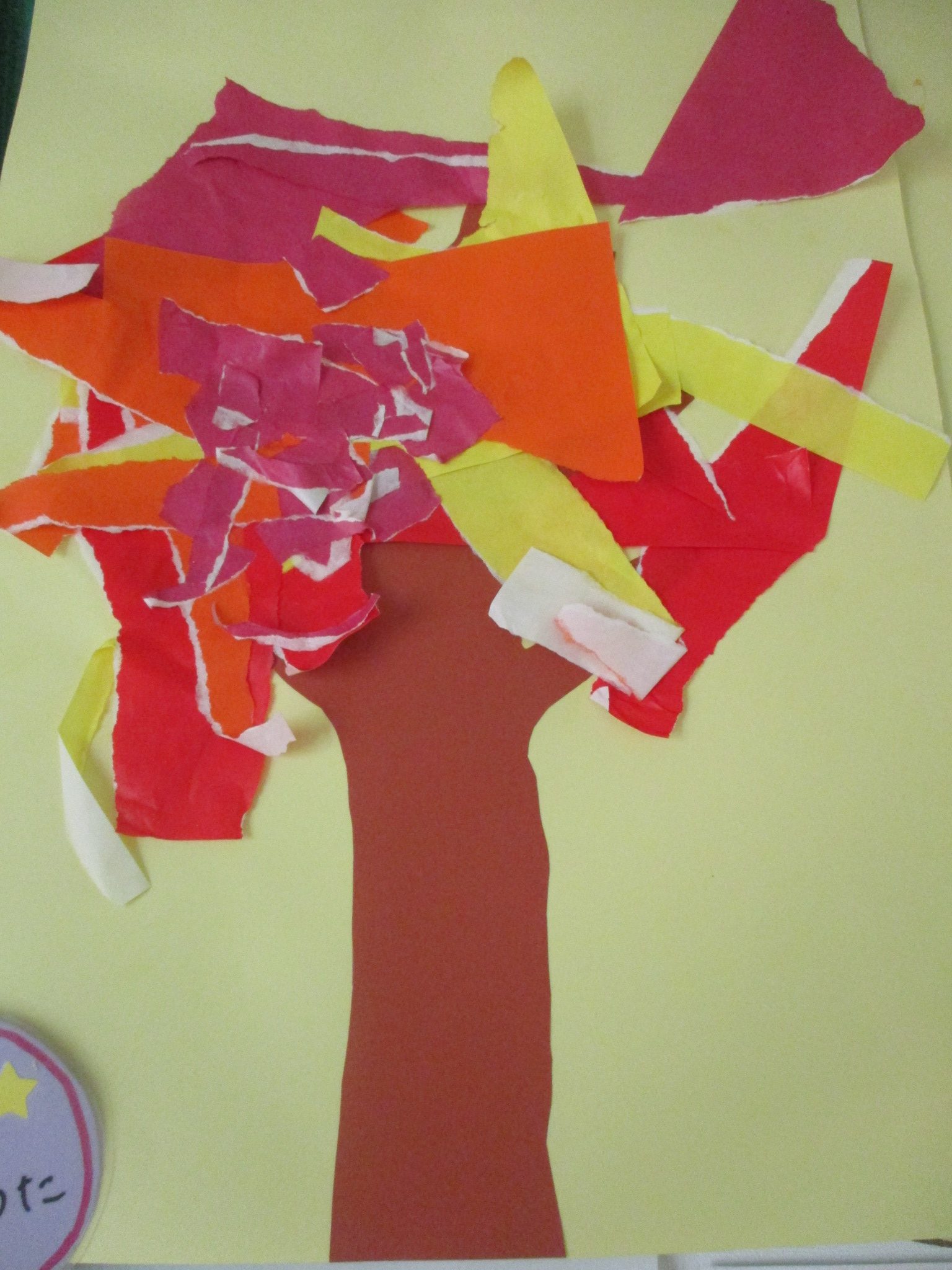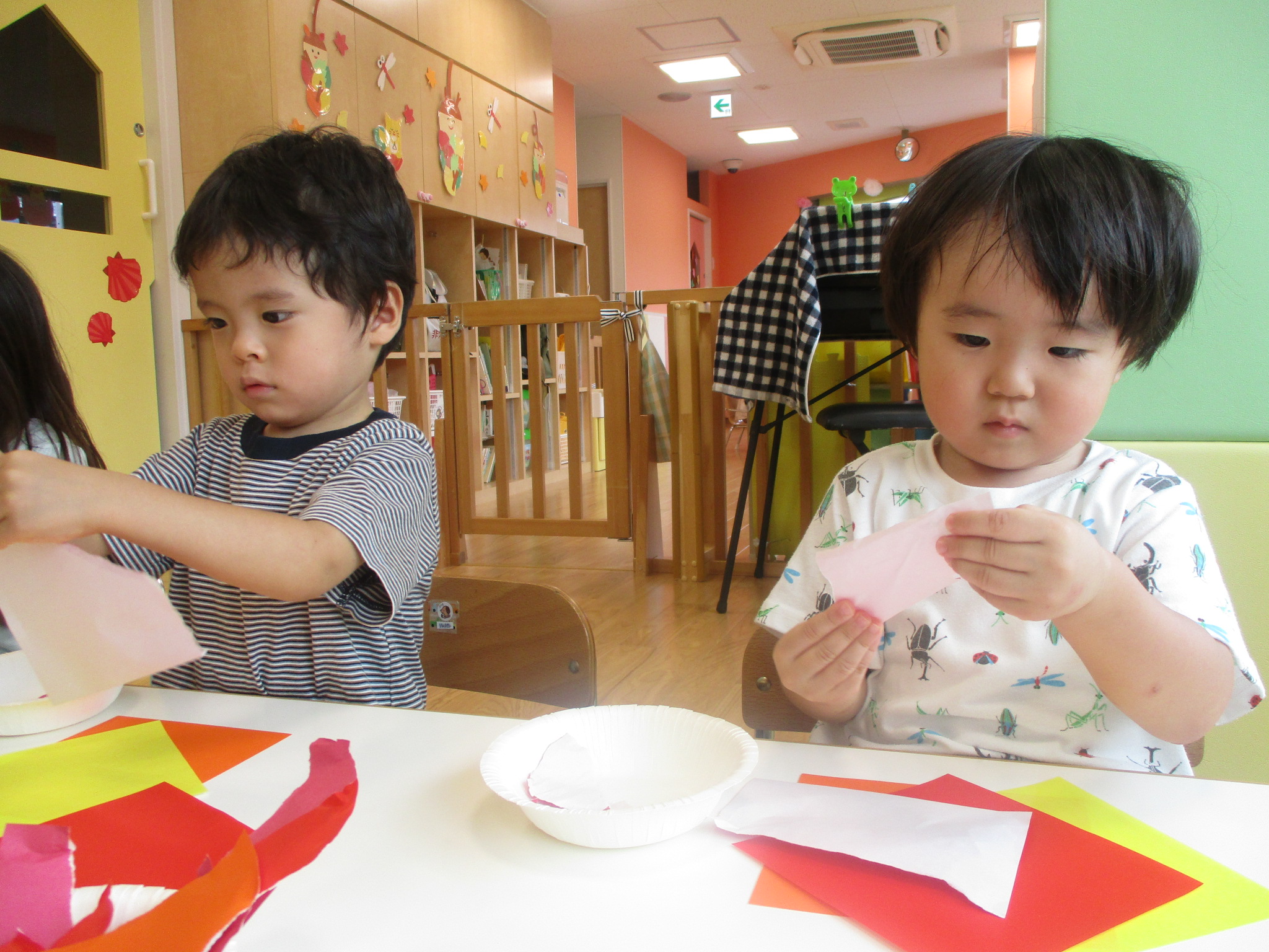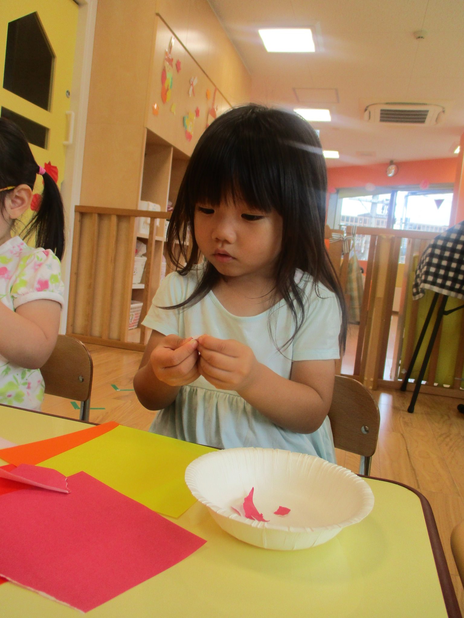 赤、黄色、オレンジ、赤紫色の折り紙をちぎっていきます