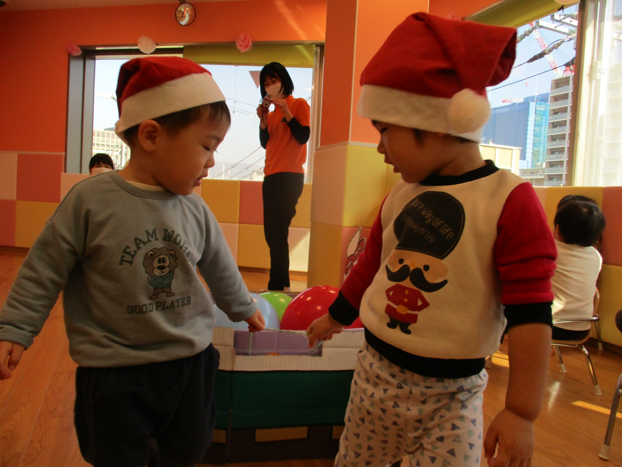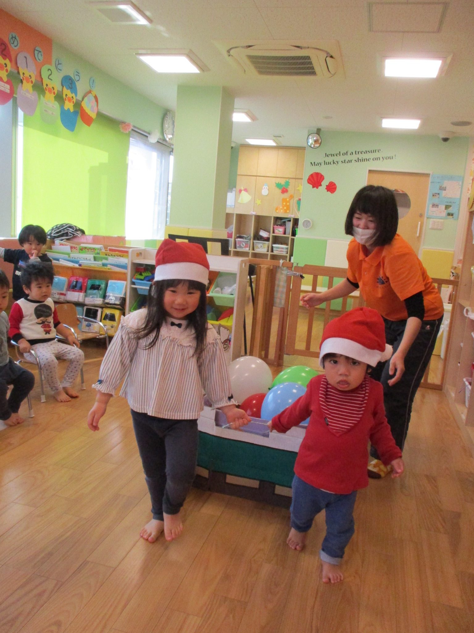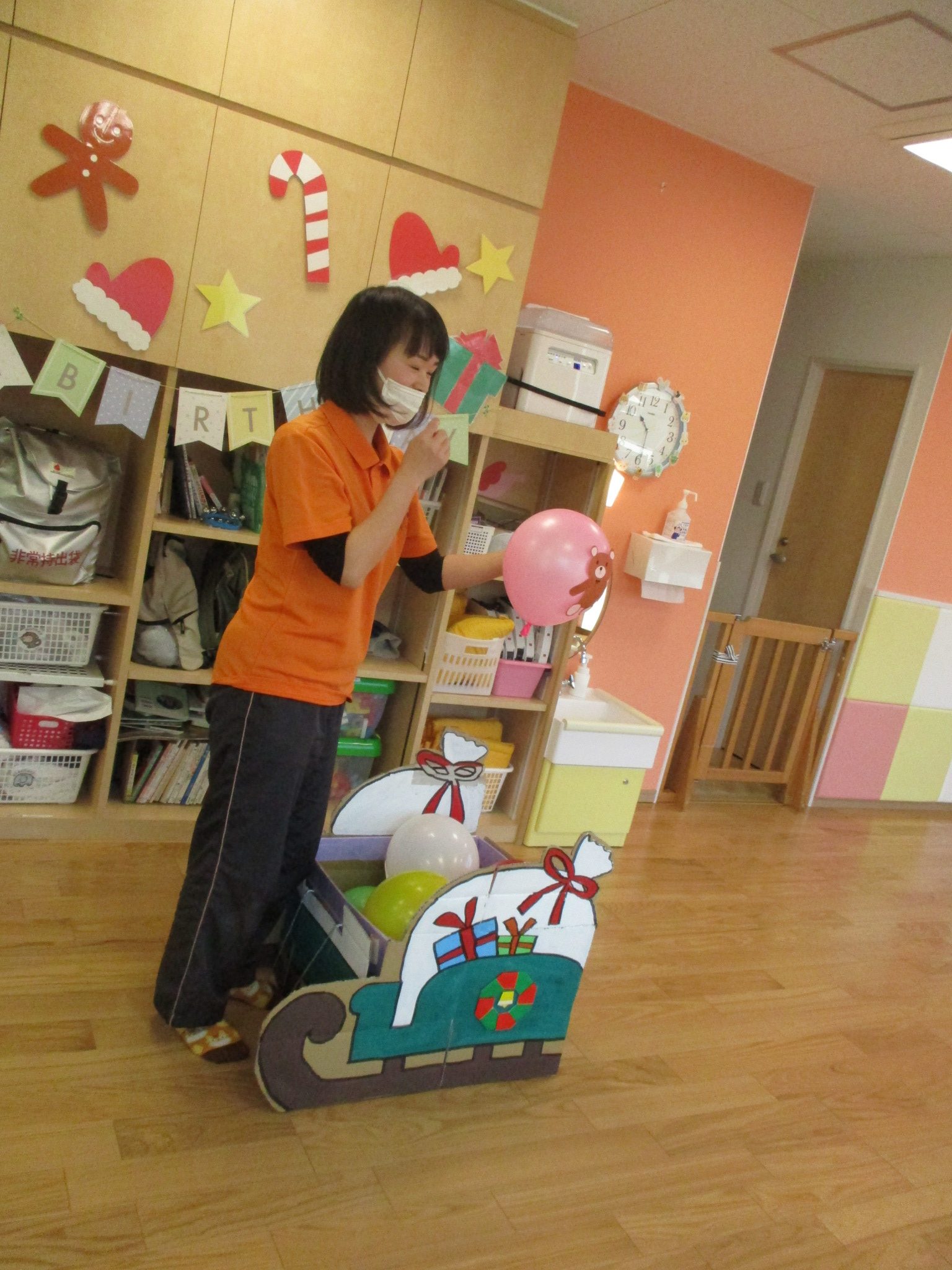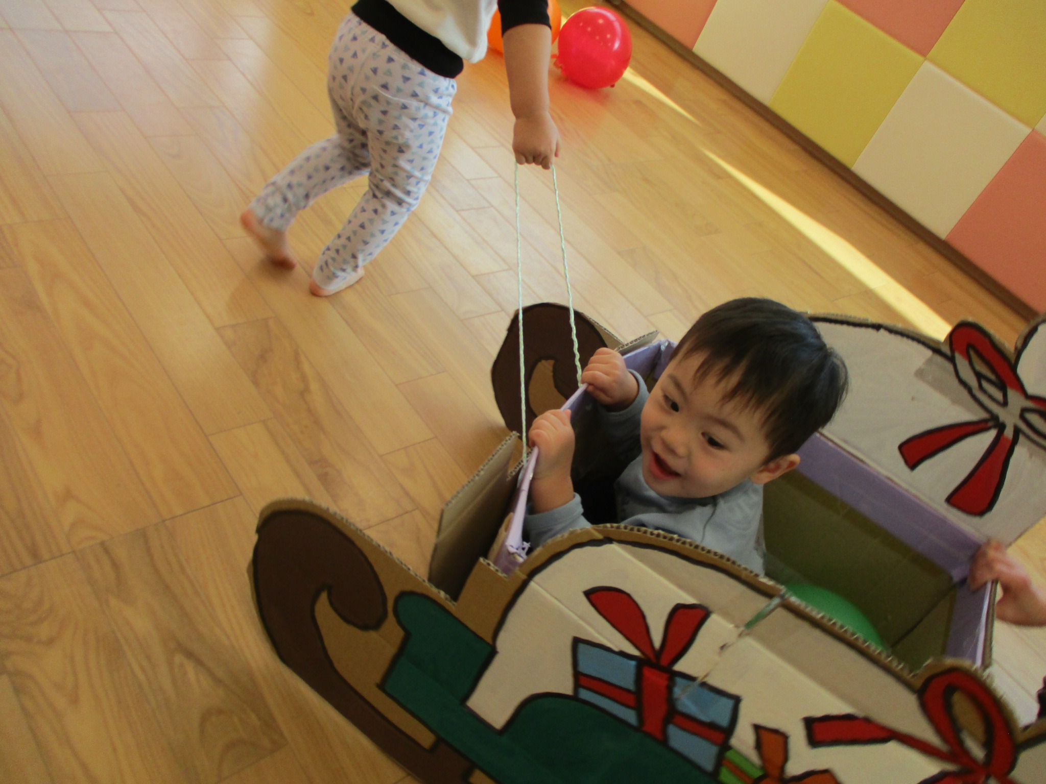 保育士お手製ソリに、風船プレゼントを乗せて