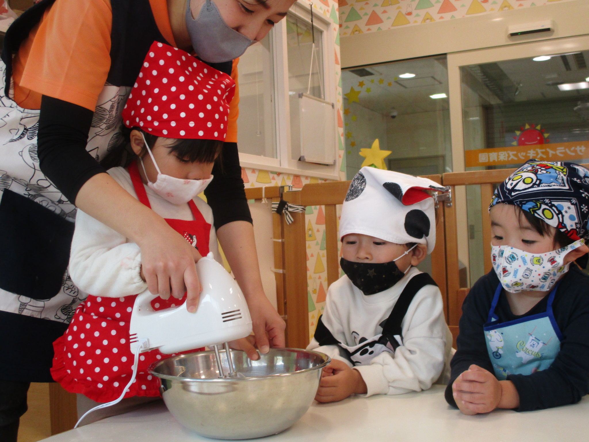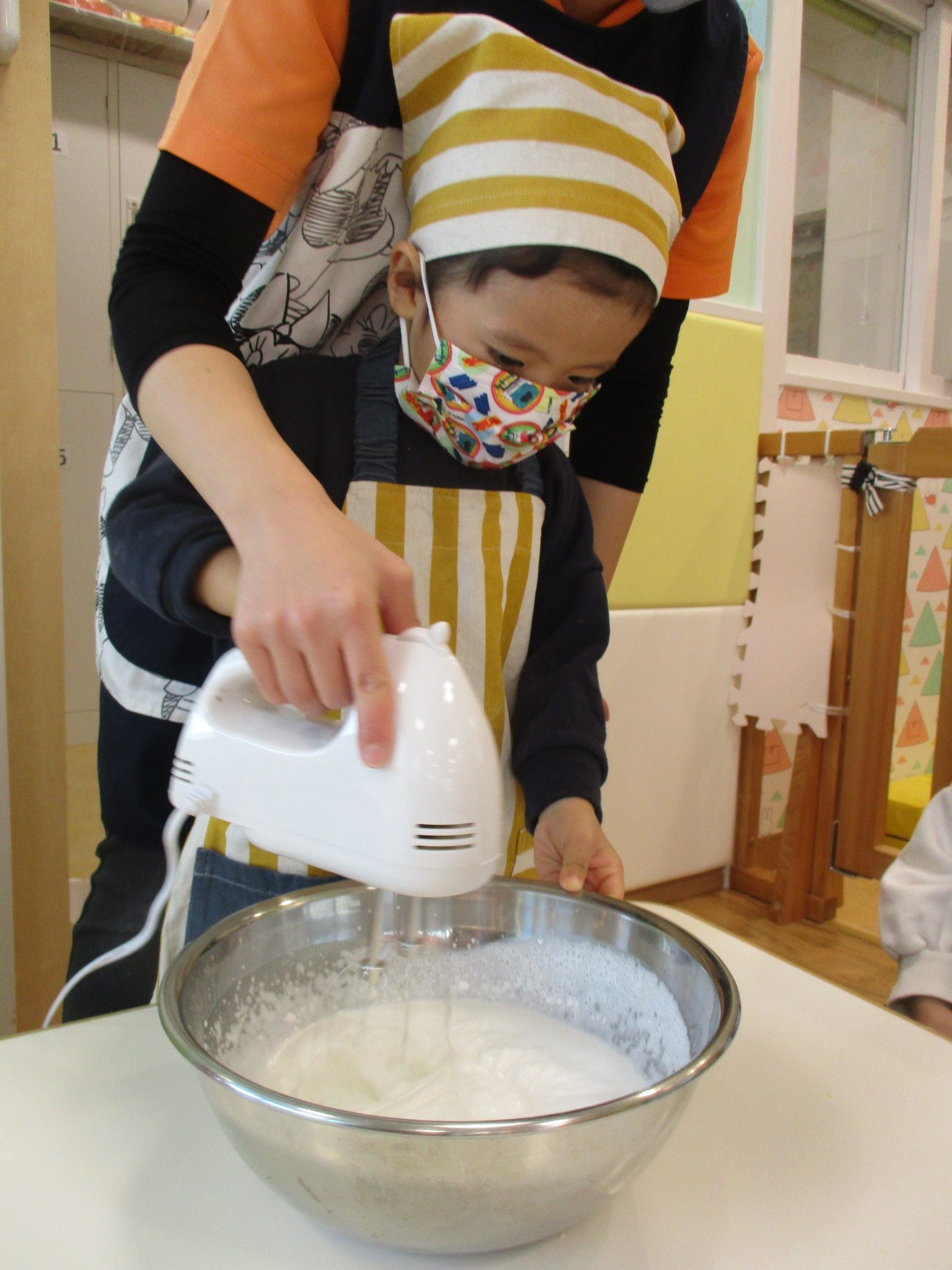 最後はみんなハンドミキサーで生クリームを作りました ![]()