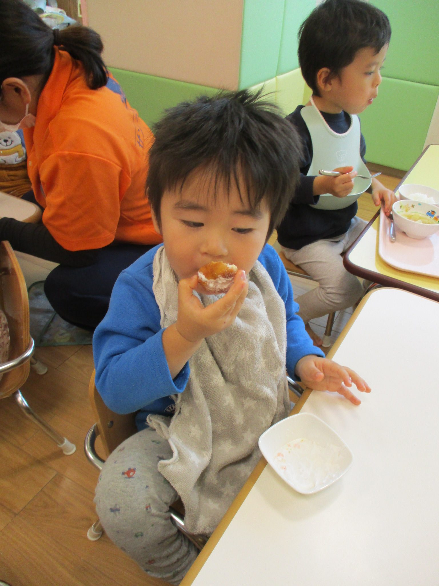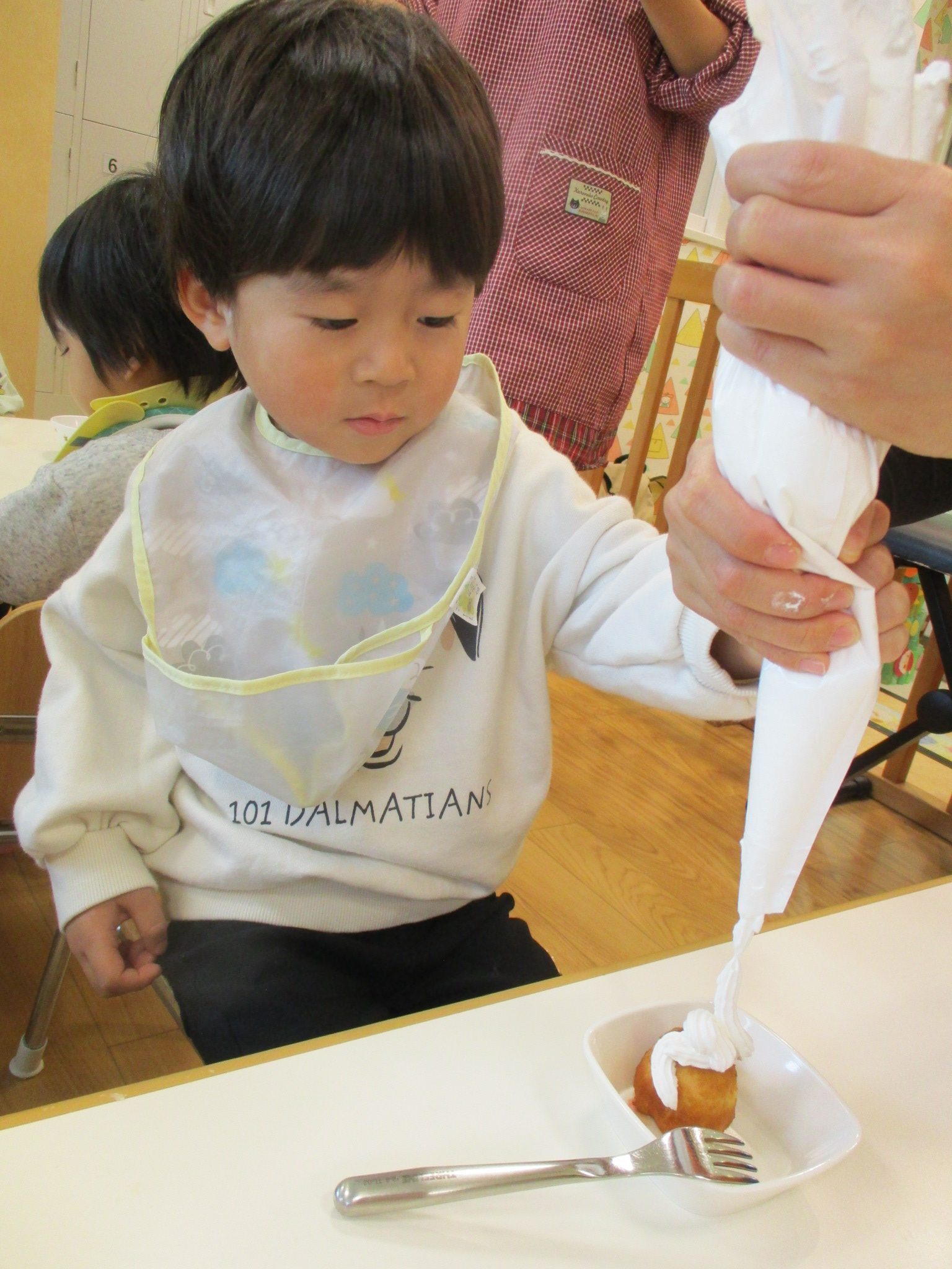 そして給食の前にみんなで生クリームをつけて、いただきました!