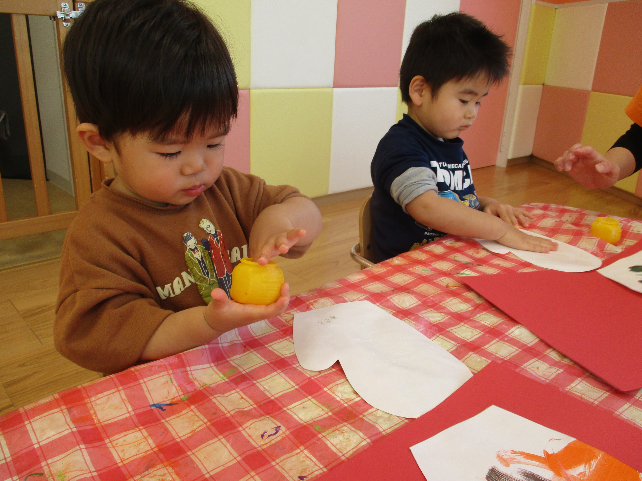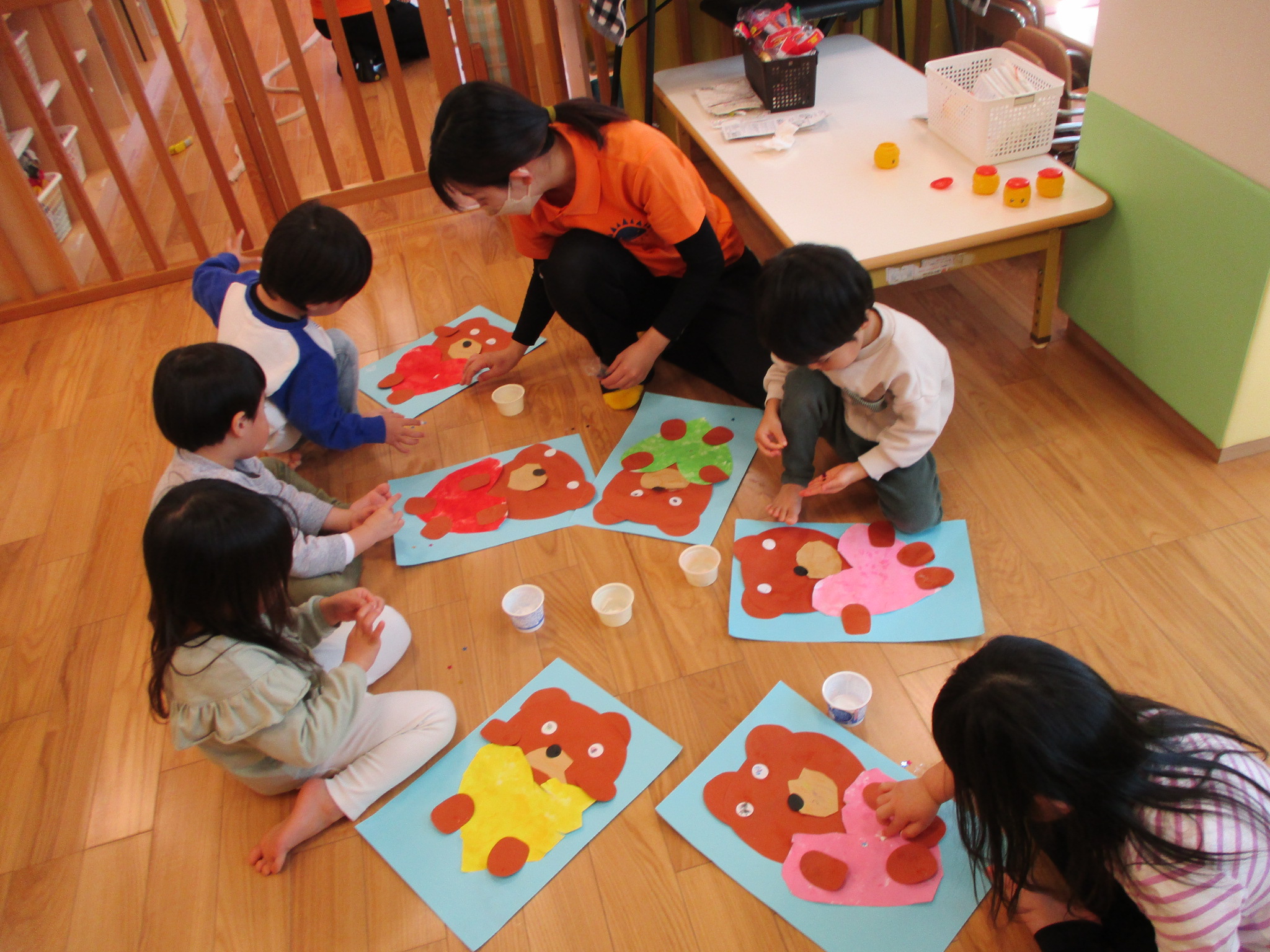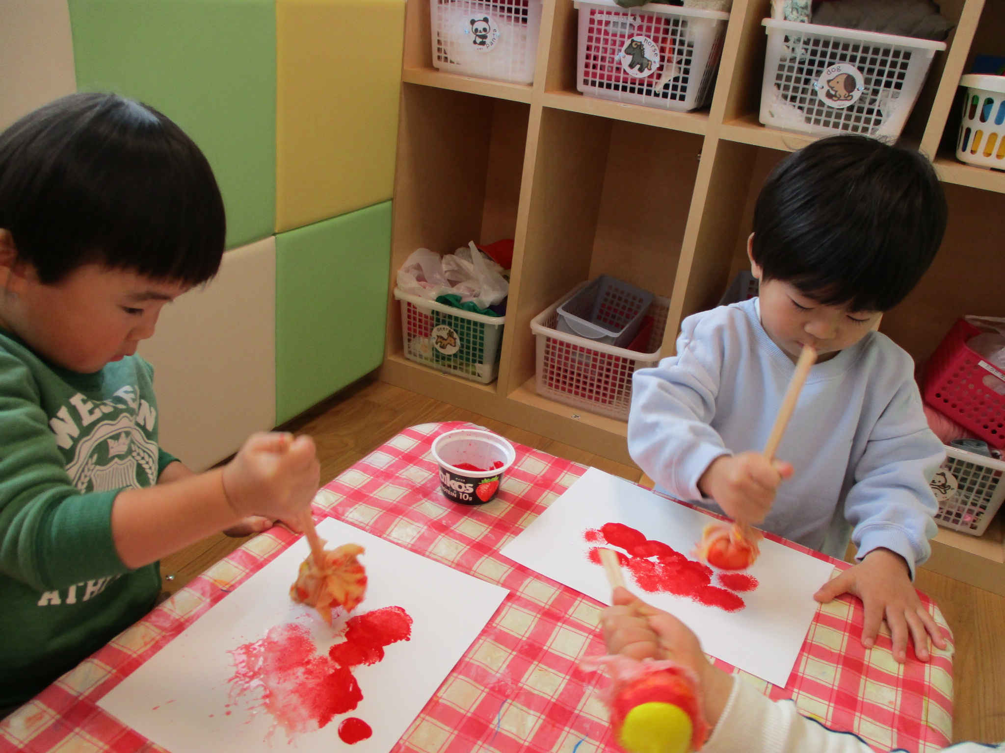 いちご組さんは大きな手袋?に模様をつけていきます