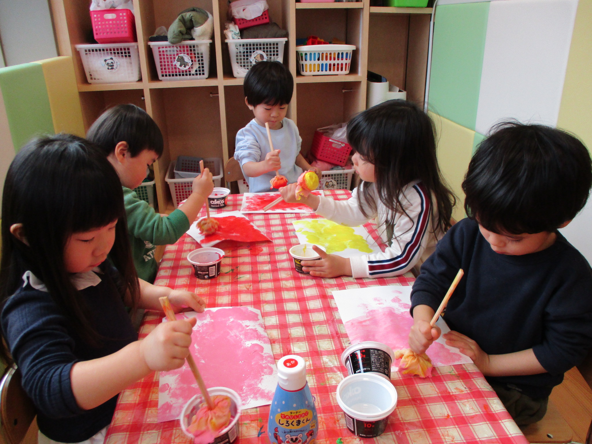 画用紙に好きな色でタンポでスタンプしていきます ![]()