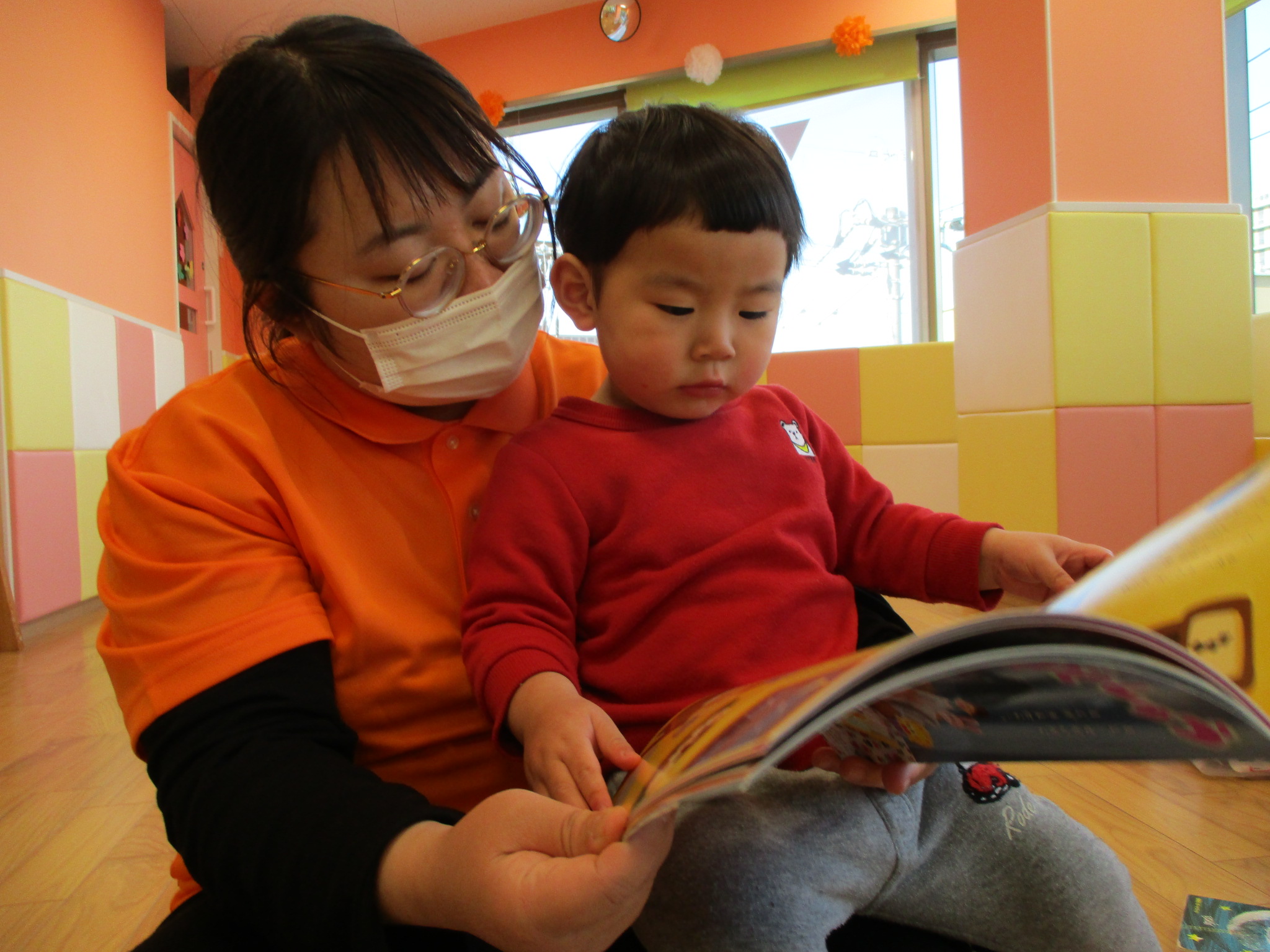 先生のお膝の上でゆったり読んでもらっていますね