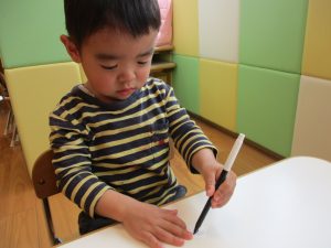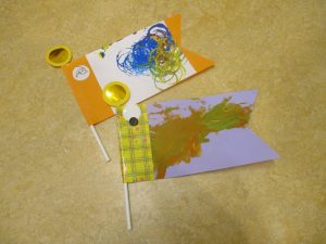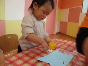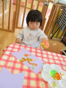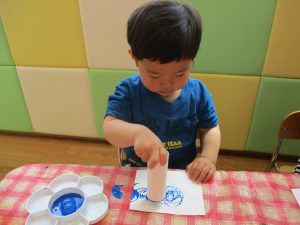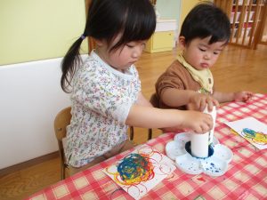 トイレットペーパーの芯、絵の具を使ってスタンプです![]()