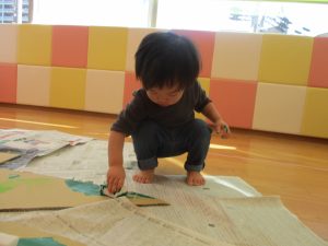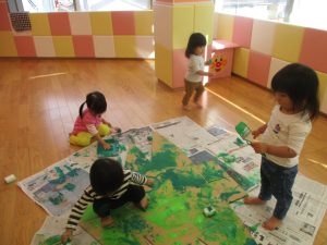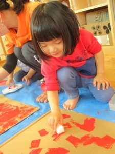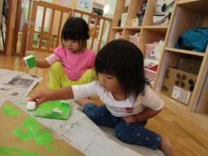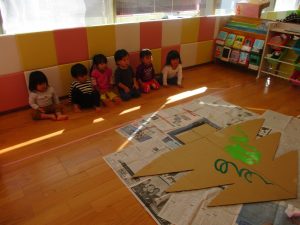りんご組さんの発表会で使う、電車製作の様子![]()