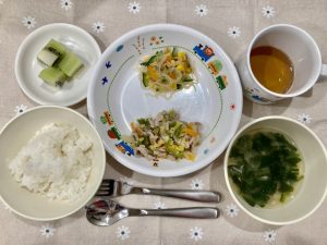ご飯 味噌汁(ほうれん草) 回鍋肉 春雨サラダ キウイ