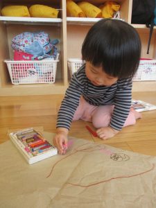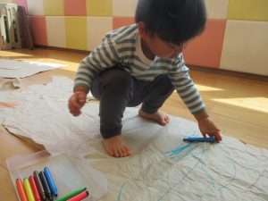 ペンにクレパス、いっぱい使って描いてるよ♪