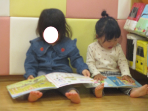 りんご組さんと一緒に絵本を読む姿も