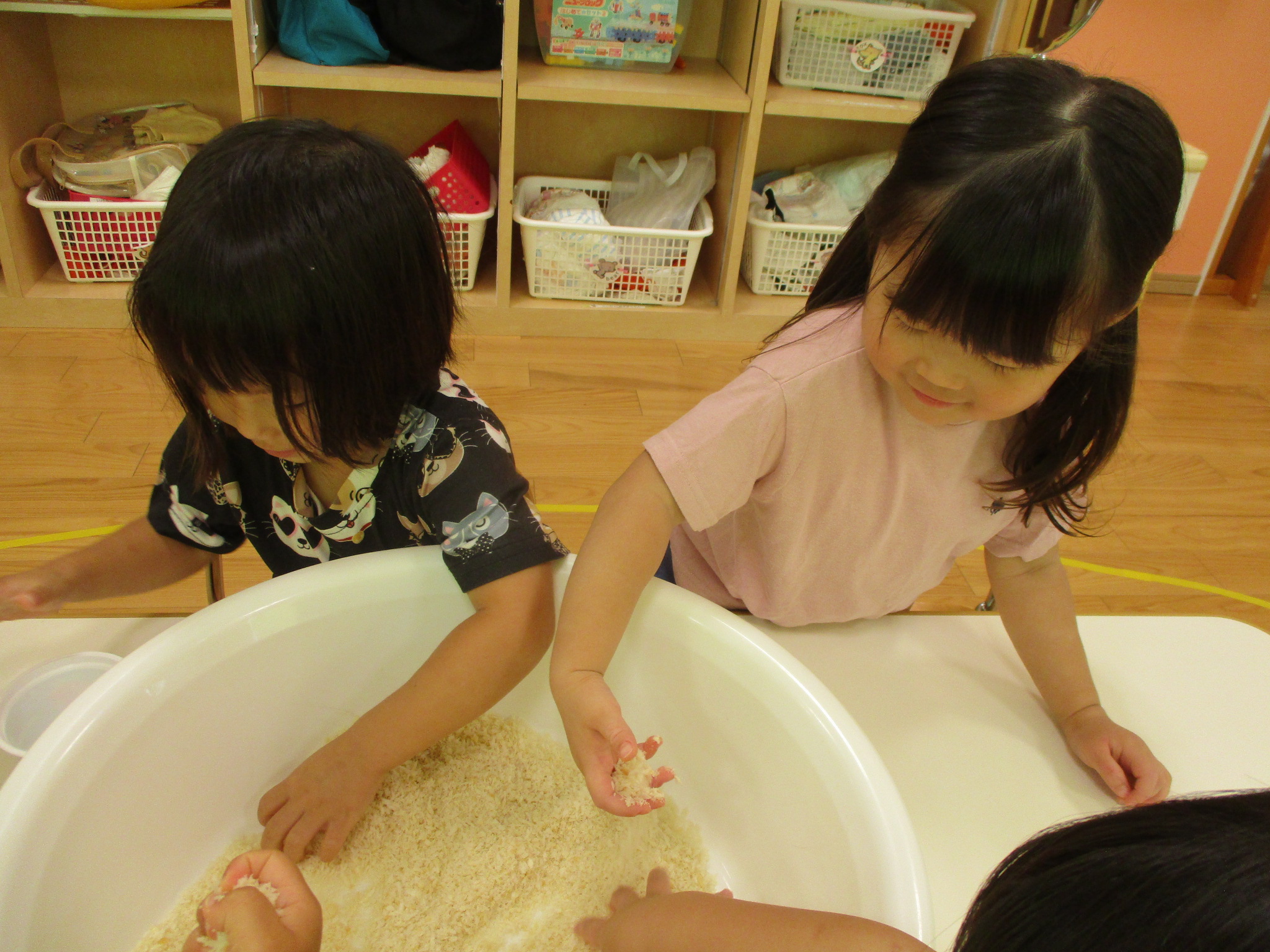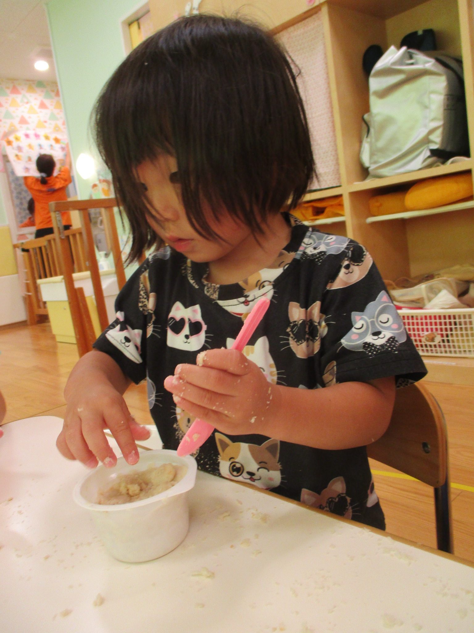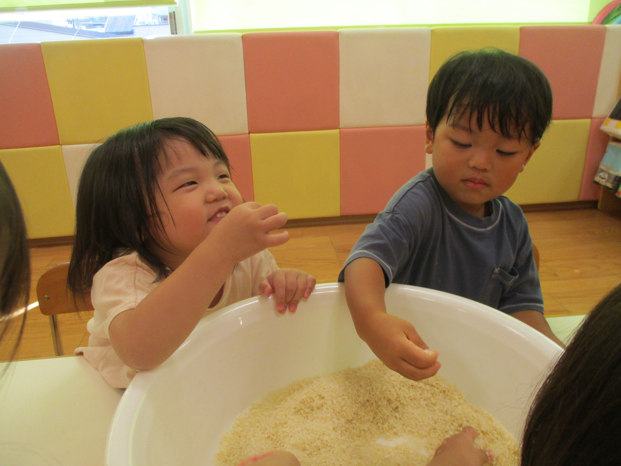 今日は感触遊びでパン粉を触った時の様子をご紹介します![]()