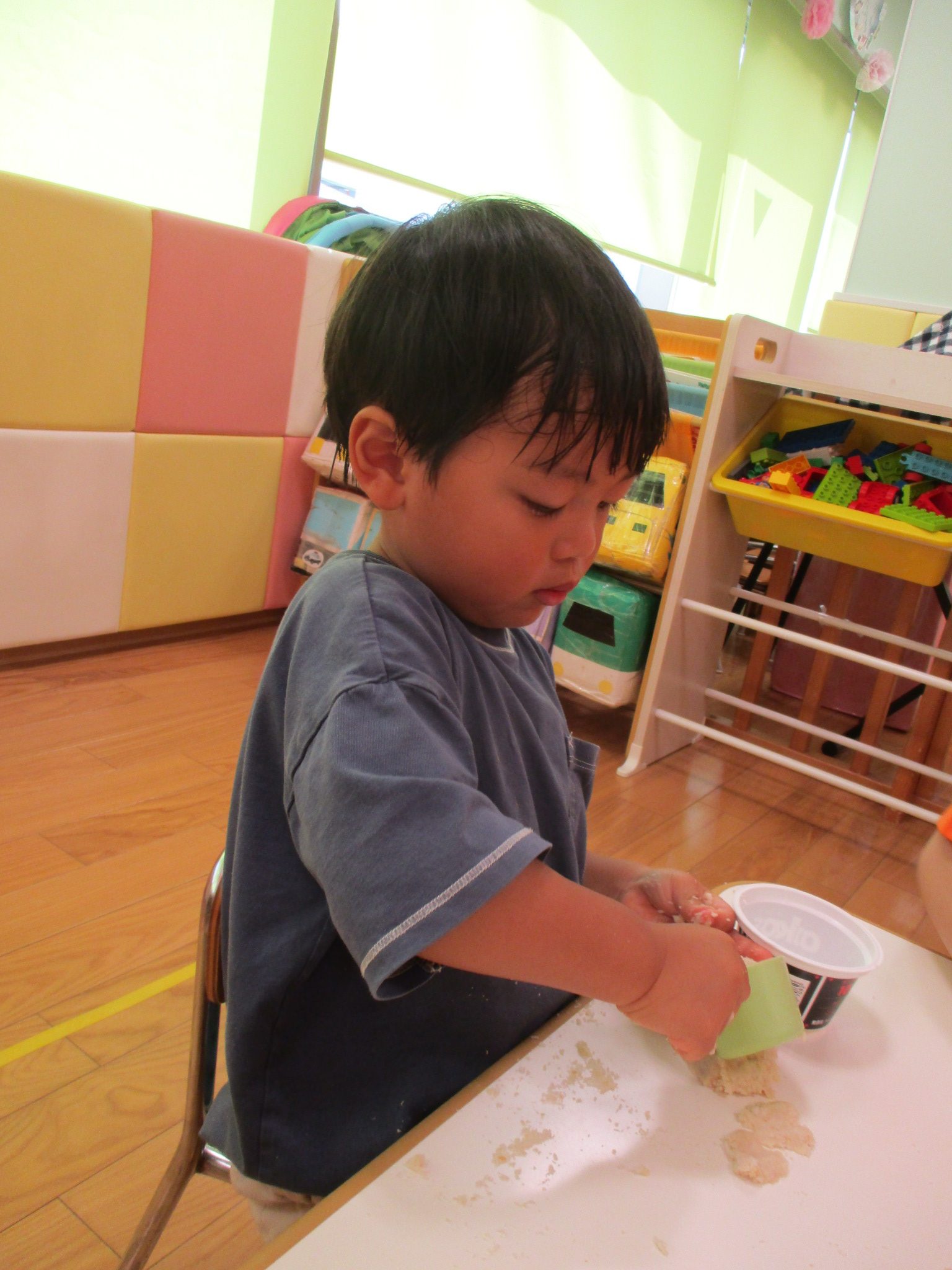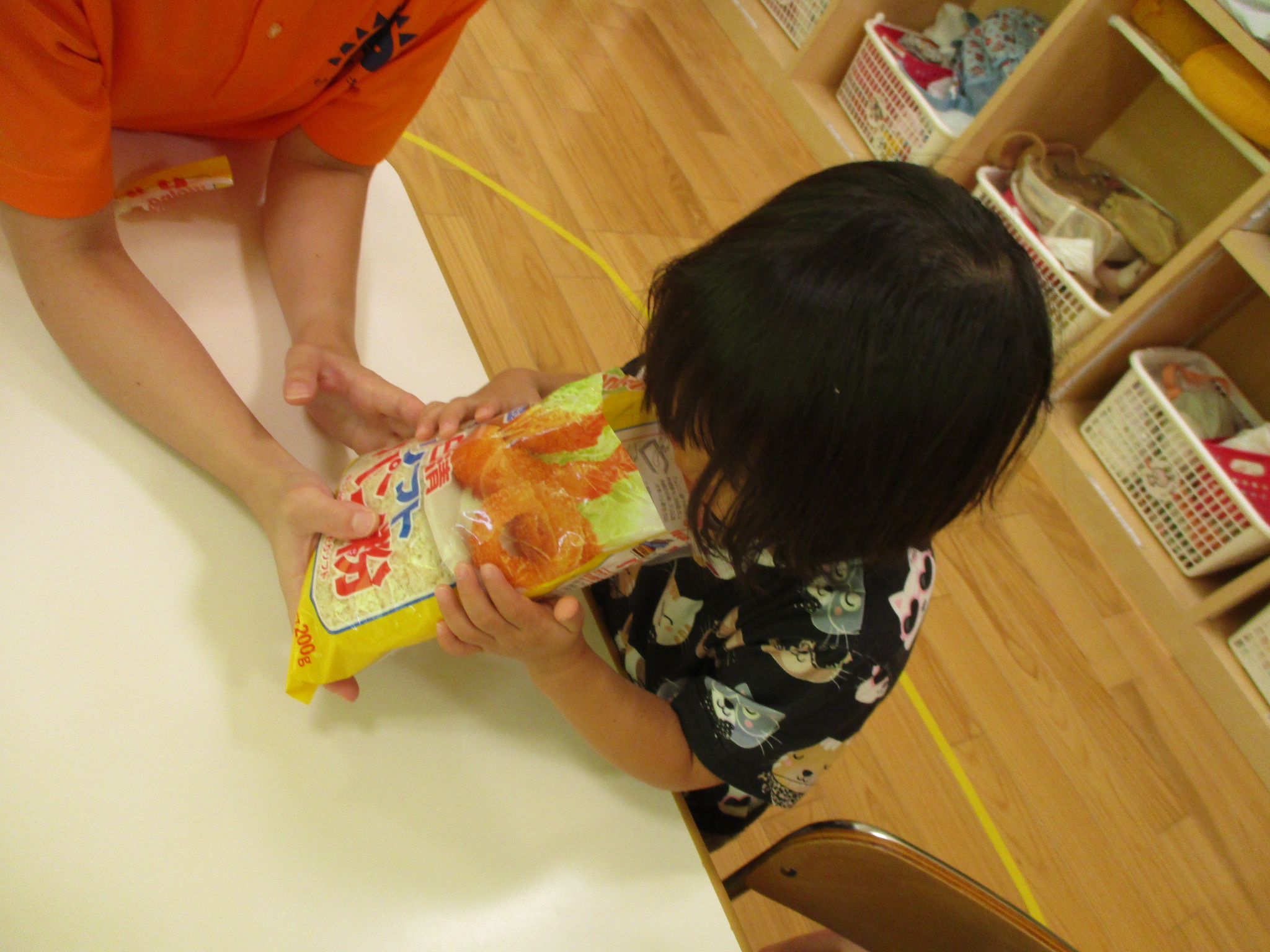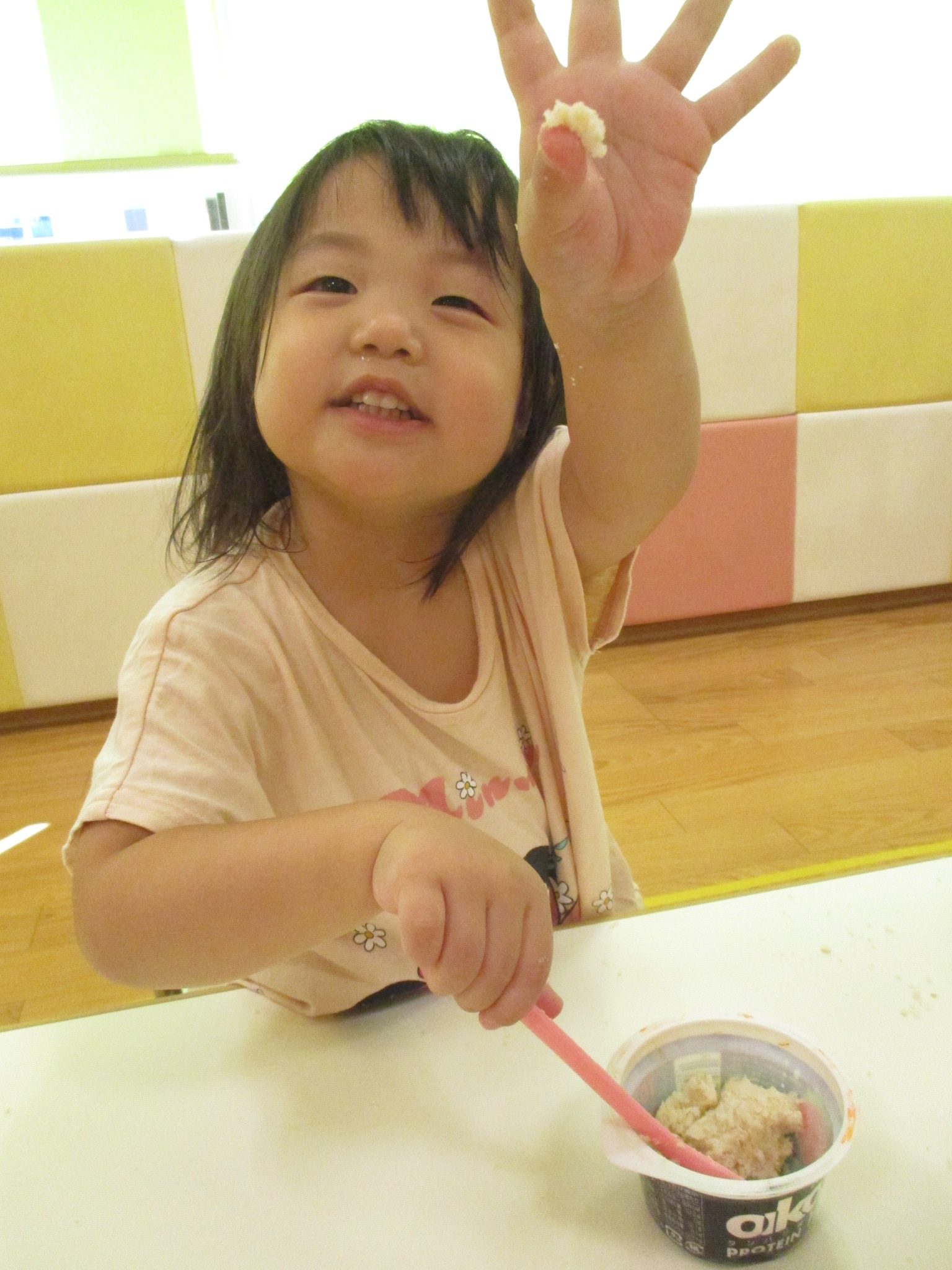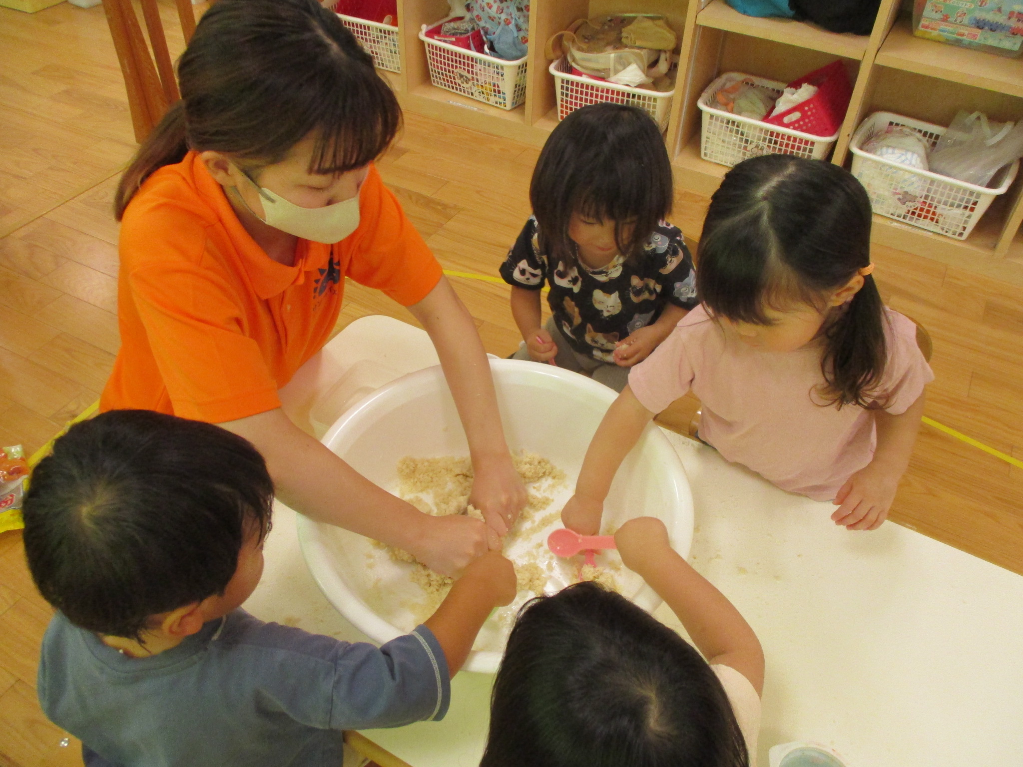 今日は感触遊びでパン粉を触った時の様子をご紹介します![]()