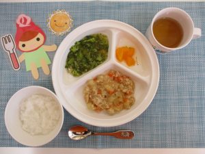 (写真は離乳食後期です。年齢によって形、固さ、盛り付け量を変えて、提供しています。)