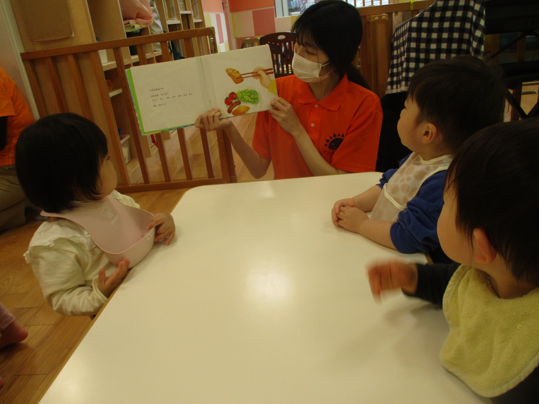 春巻きやほうれん草、ご飯と美味しそうな料理🍳がたくさん登場し、ページをめくる度に『おいしそう^~』とみんな笑顔になります