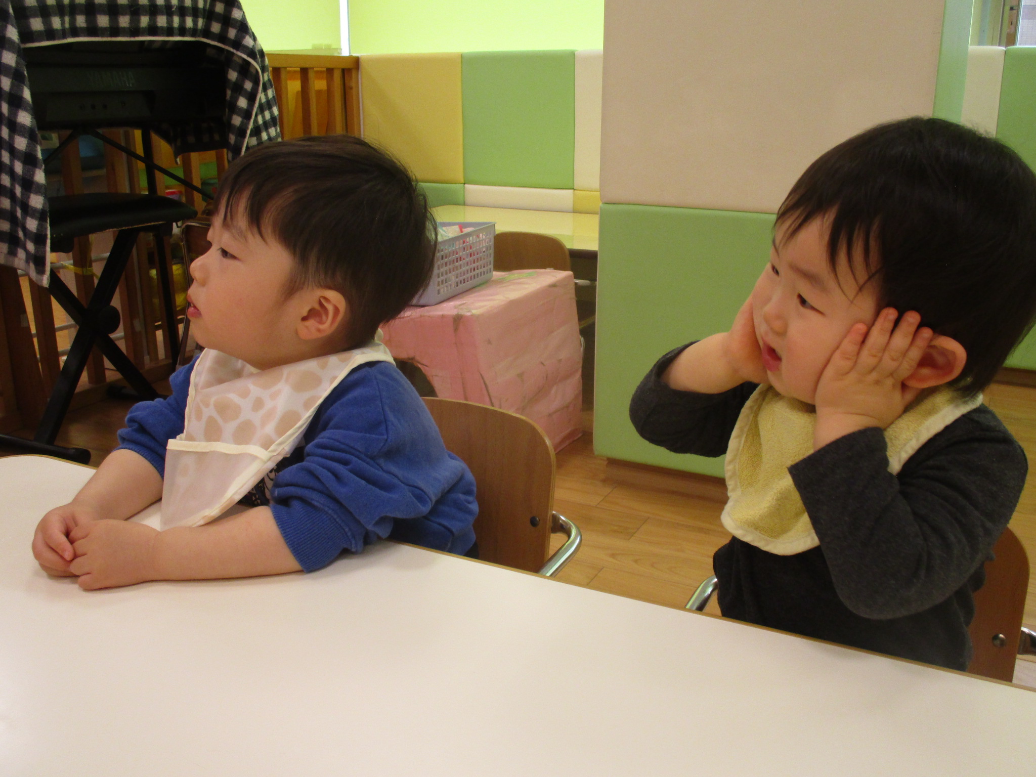 「あぁ おいしい」のところでは手をほっぺに当てて一緒に『おいしい』のポーズ