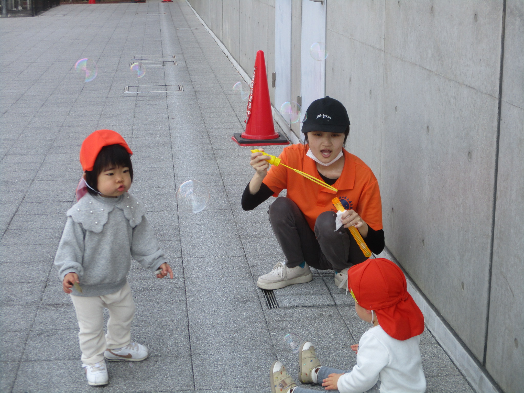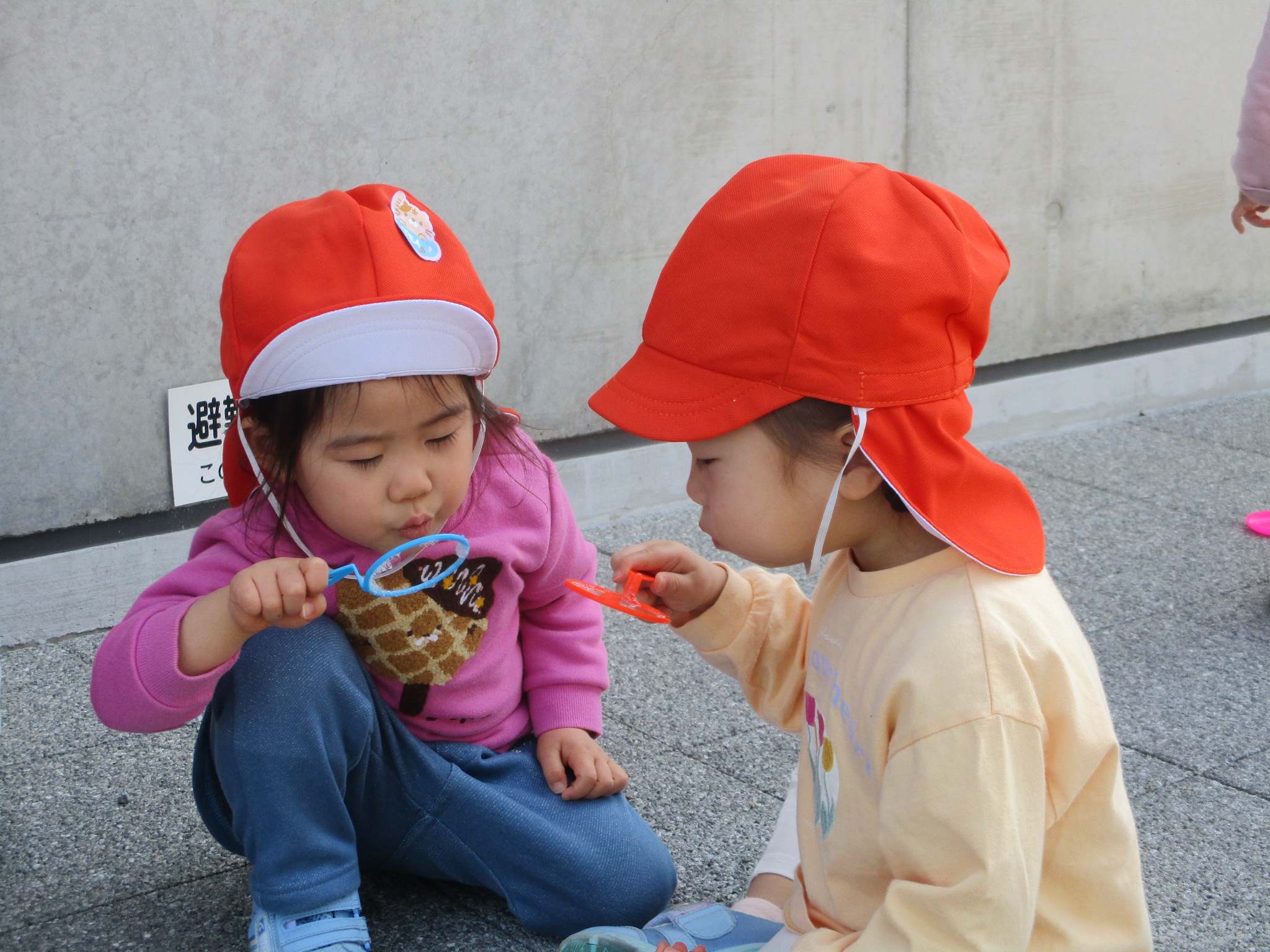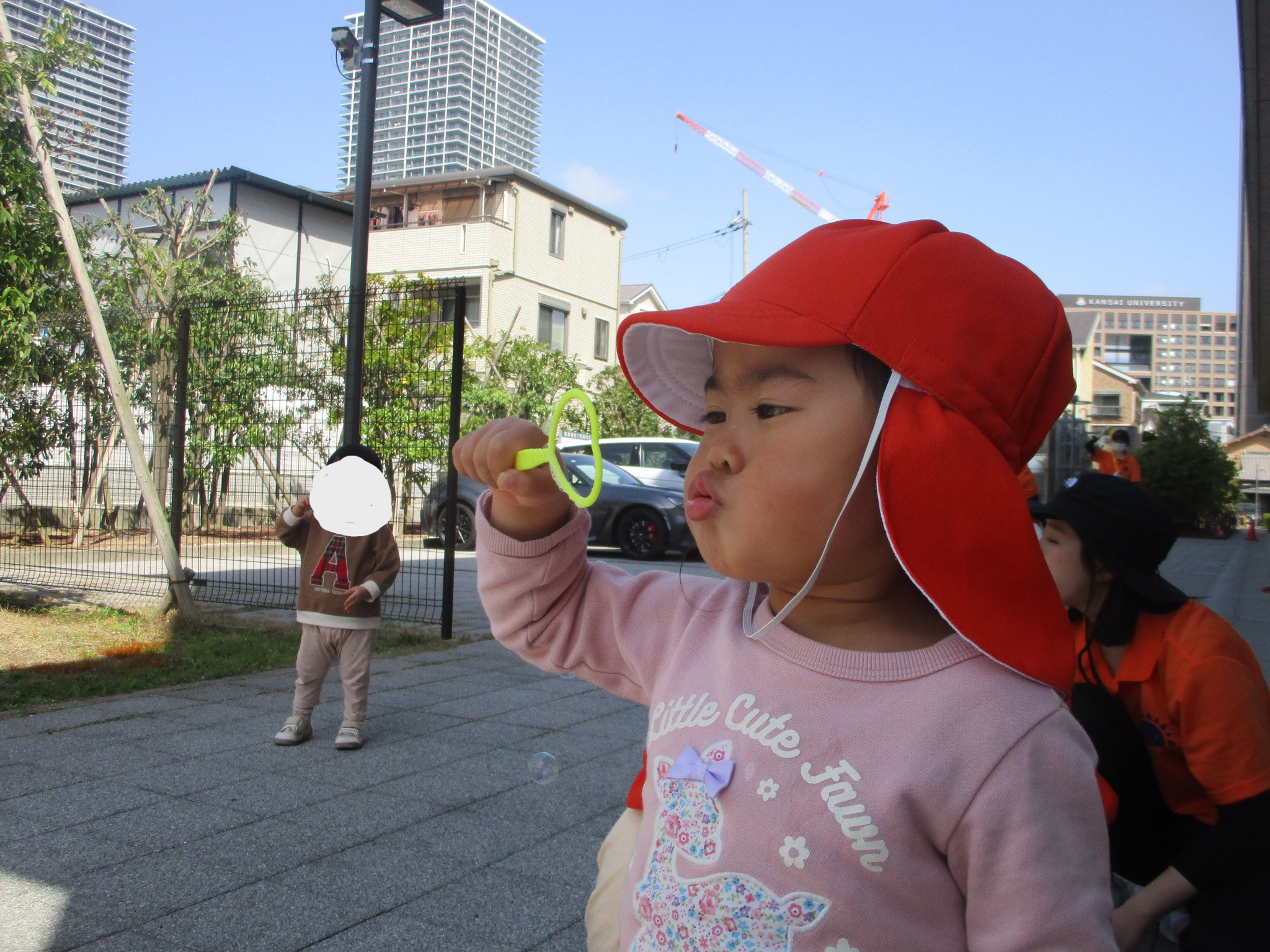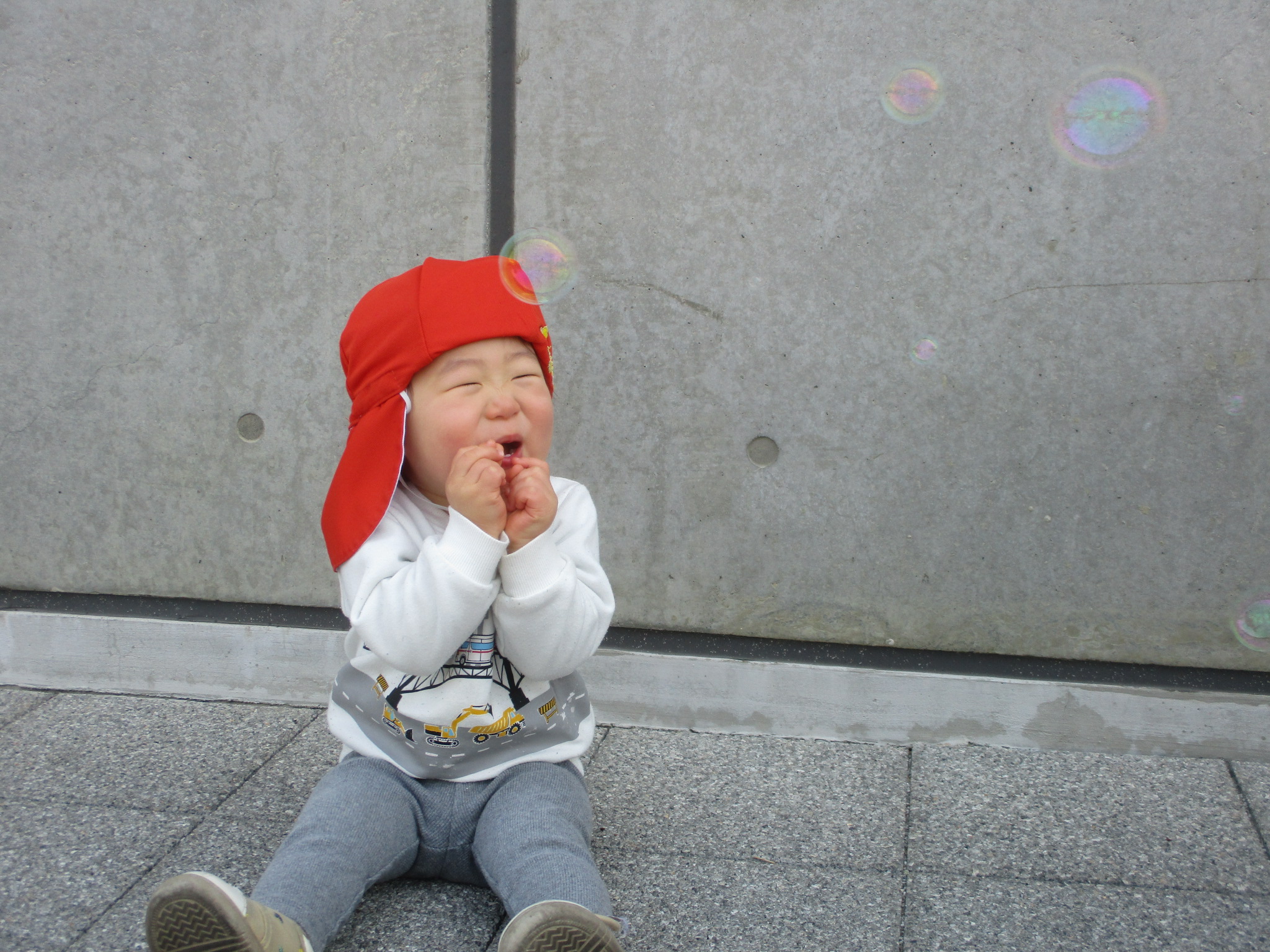 いちご組さんは保育者が作るシャボン玉を追いかけたり、「パチン!」と手で割ってみたりと遊んでいました