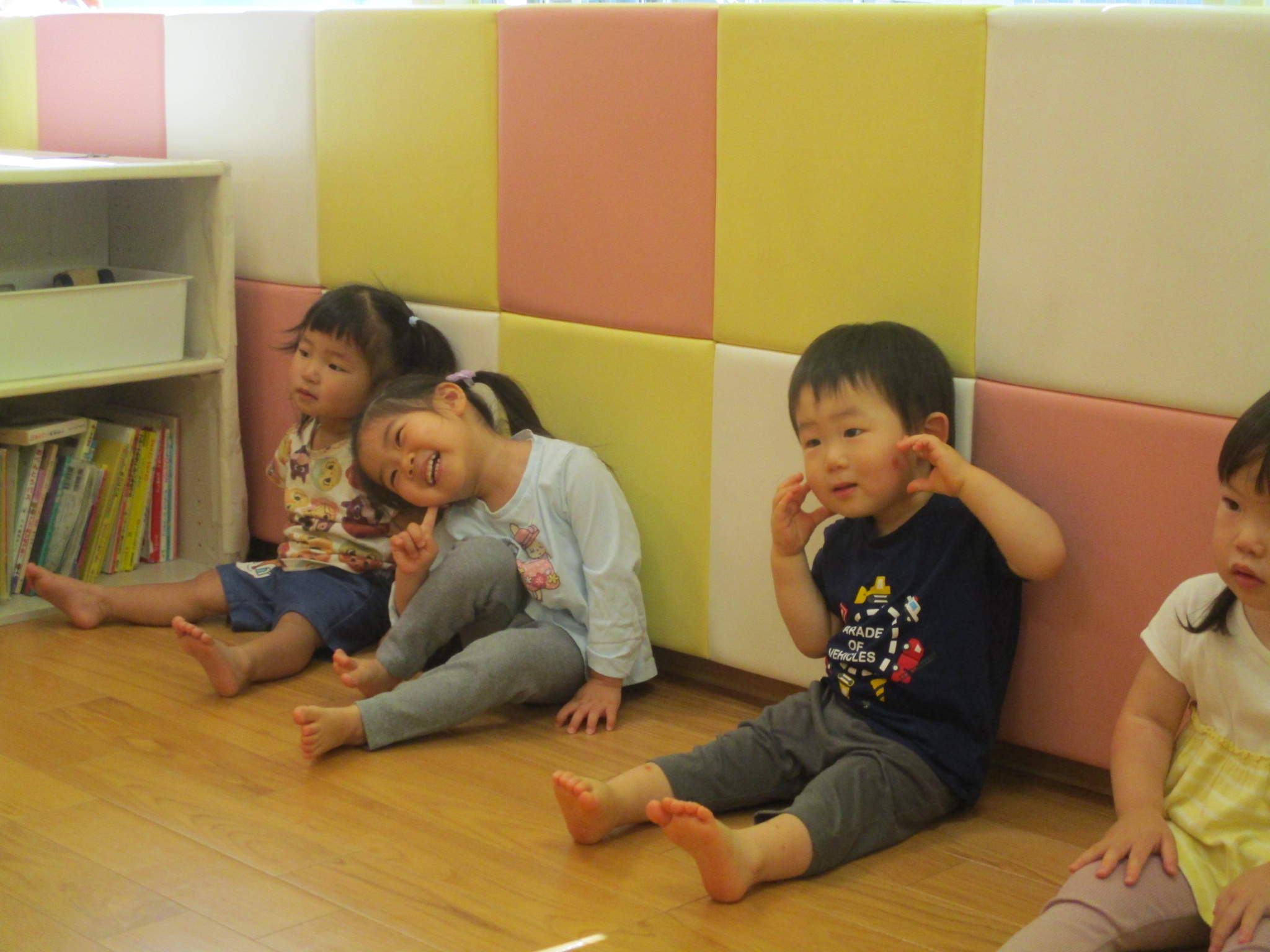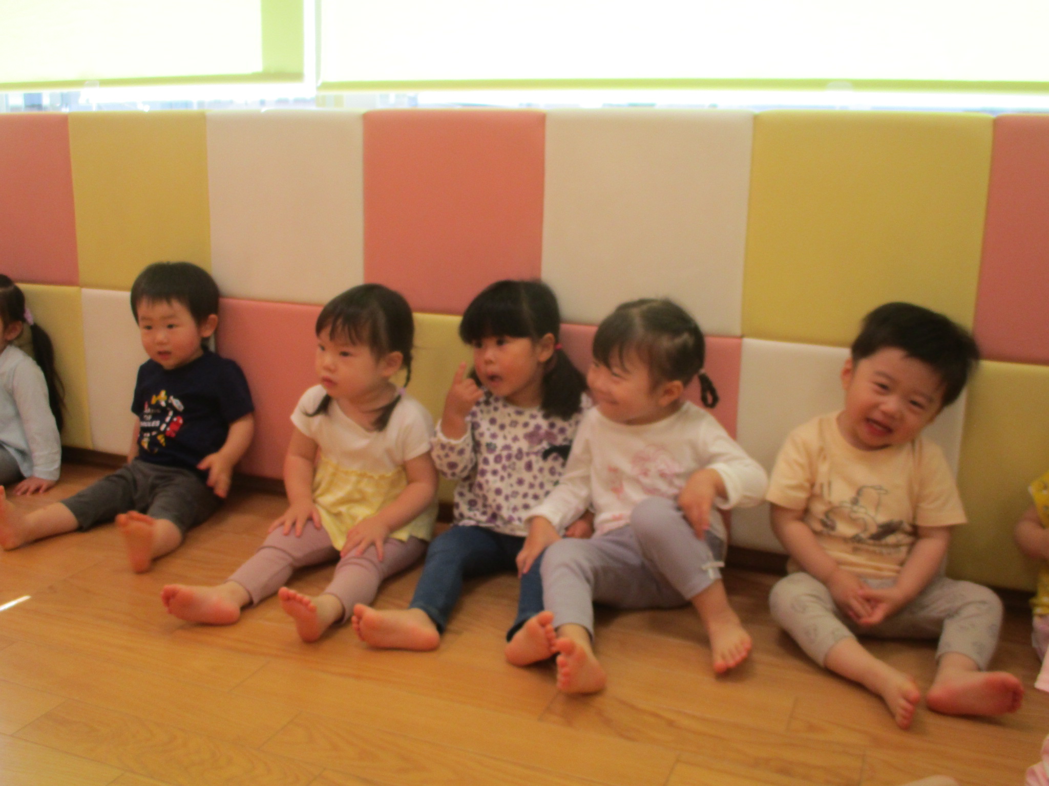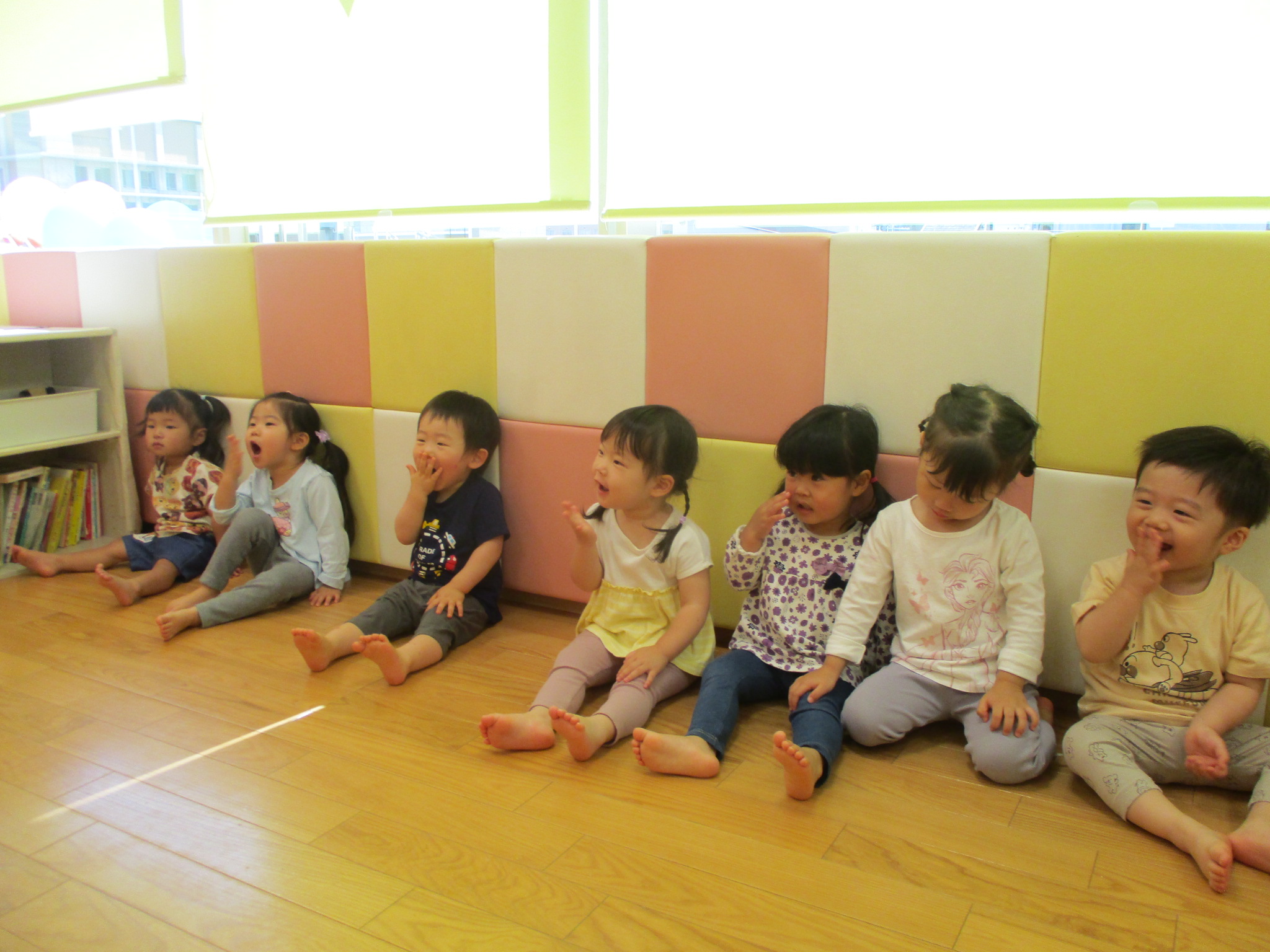 りんご組のお友だちは保育士が読むと真似して「まるまるこまる」や「まるまるにっこり」、「まるまるははは」と」ニコニコの笑顔で真似をしてくれます![]()