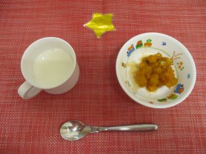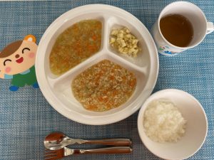 (写真は離乳食後期です。年齢によって形、固さ、盛り付け量を変えて、提供しています。)