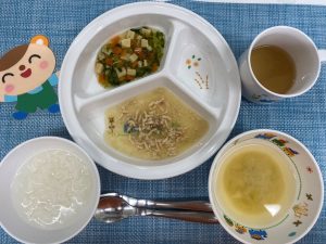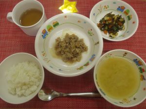(写真は離乳食後期です。年齢によって形、固さ、盛り付け量を変えて、提供しています。)