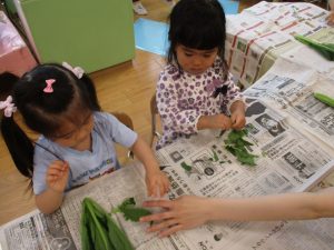 絵の具を葉っぱに上手に塗れるかな?