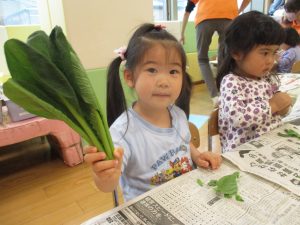そのあとは葉っぱに絵具を付けて野菜スタンプに✨