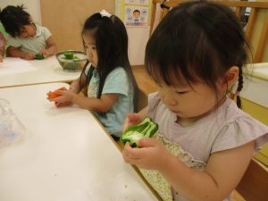 ピーマンを手で持って感触を楽しみます。