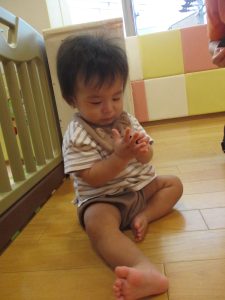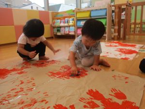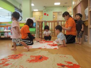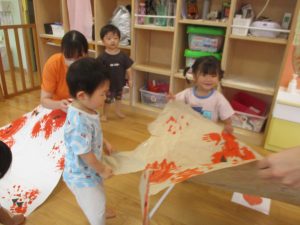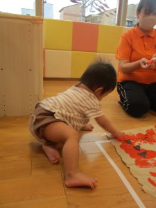 今日はいちご組さんともも組さんと一緒に、三角に切った黒い折り紙を貼っていきます。