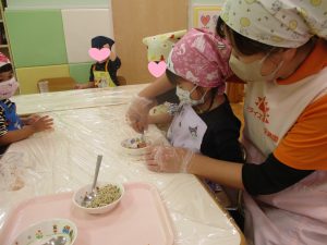 そのあとは縮緬雑魚とふりかけの材料を混ぜ混ぜ♪