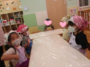 エプロンと三角巾、マスクを着けて準備完了!頑張るぞー✨