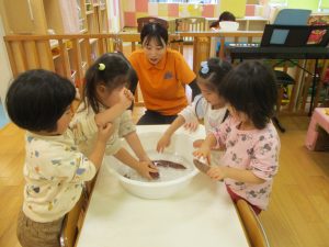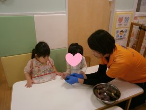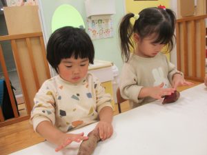 」「おもたーい♪」とさつまいもを触って感触を確かめる子どもたち![]()