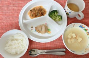 サンライズキッズ保育園 ◎給食の様子 今日は、豚肉のマーマレード焼きでした。豚肉はマーマレードジャム...