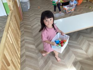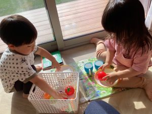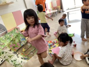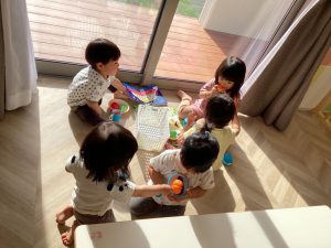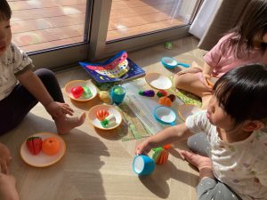 保育士の「レジャーシート」の発想が、このように子どもたちの遊びを広げ、友達の輪も広がりました。ゴールデンウィークにピクニックに行った記憶が残っている園児さんもいらっしゃるのかもしれません。思い出が遊びへと発展していく様子がとてもかわいらしいですね。