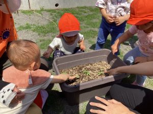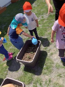 アサガオは芽が出てきました!お花の赤ちゃんだよ〜と話すと、「大きくなってね」と撫でてくれてます?