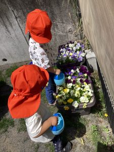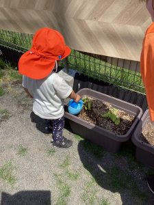 園庭に出るとみんなで一緒に植えたきゅうりの苗やアサガオ、パンジーにお水をあげるお手伝いをしてくれます✨