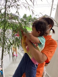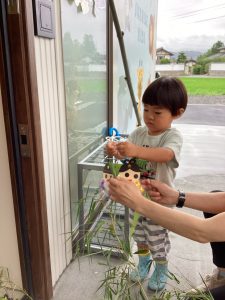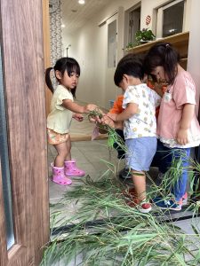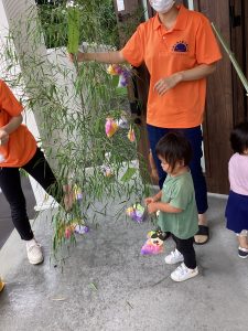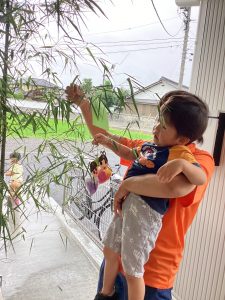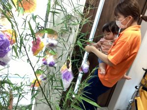 先日から取り組んでいた笹飾りも完成し、とっても個性的で可愛らしい織姫と彦星が完成したので、みんなで笹に飾ってみました