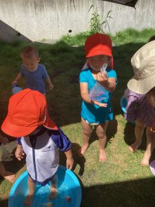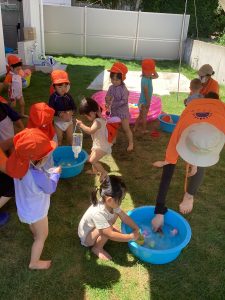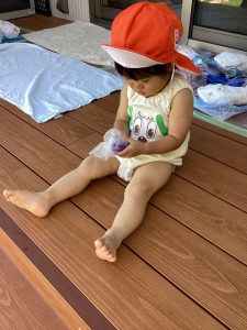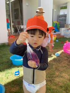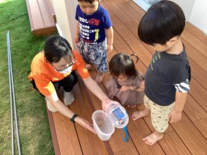 今週の水遊びではお庭に咲いたアサガオで色水をつくりました