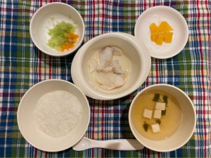 粥 すまし汁 魚煮 二色煮びたし オレンジ