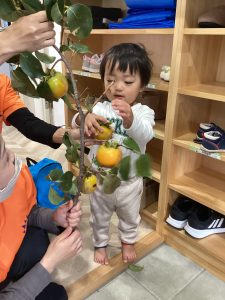 お散歩帰りにお隣のお家の方から柿をたくさんいただいたので