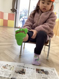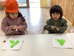 こちらは足型のツリーにキラキラシールを貼って飾り付けています
