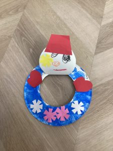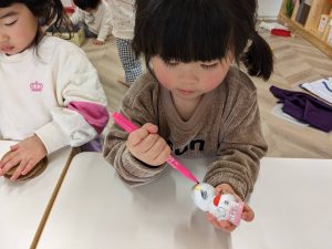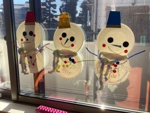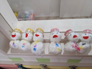 その後はお顔を書いたり、帽子や手袋、お花をのりでつけて飾り付けしました