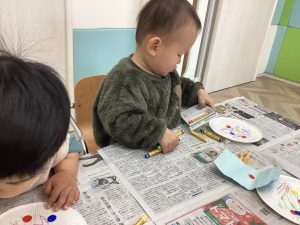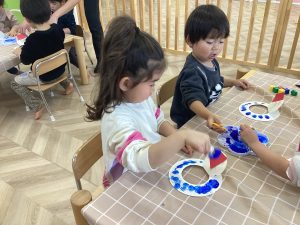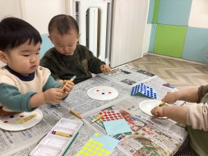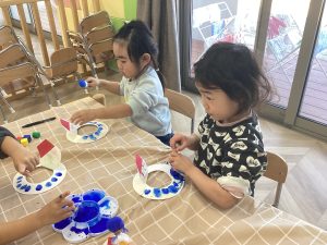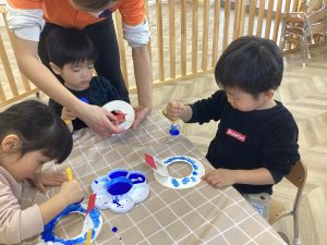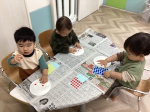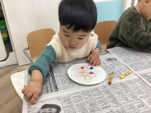 紙皿に絵の具をつけたタンポでポンポン色をつけてみました