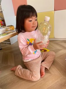 剥がした紙千切ってペットボトルに入れ、フリフリします!