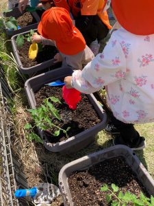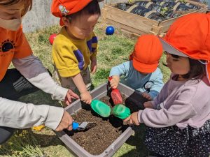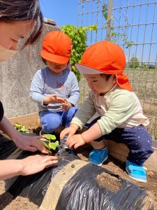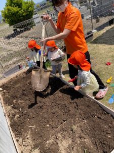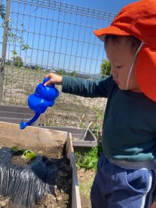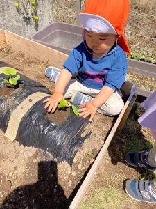 豊科園では食育の一環で畑にスイカ、トマト、ピーマン、きゅうりの苗を植えました