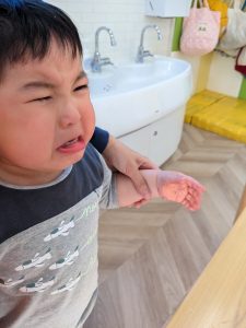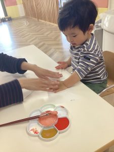 初めての筆や絵の具の感触に驚いて泣いてしまう子もいました…💦