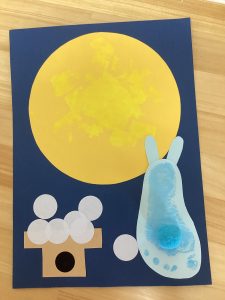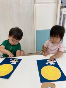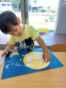 お月様にスタンプをして、お供えするお団子を貼りました