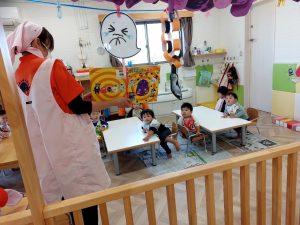 遊びの中でも、おばけになって「お菓子くれないとイタズラしちゃうぞ〜」と