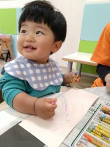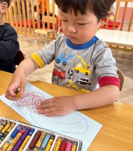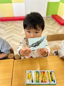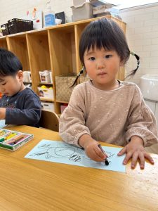 お散歩の際にお花や石など、宝物を持って帰れるようお散歩バッグを作るために、お絵描きをしました。